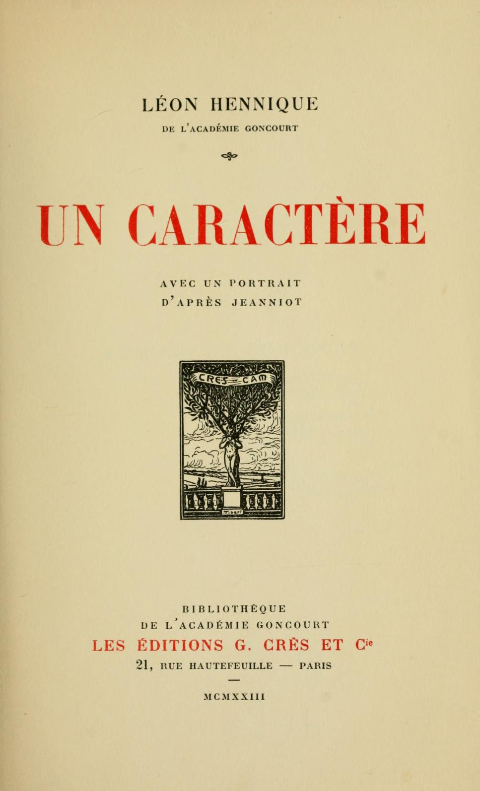 Title page of ‘Un Caractère’ by Léon Hennique, published by G. Crès et Cie, Paris, 1923. Part of the Bibliothèque de l’Académie Goncourt series, with a portrait after Jeanniot.
