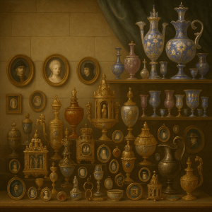 Here stood silver, bronze, and copper caskets; gilded pitchers, frosted crystal goblets; sacred vessels, incense burners, figurines carved from onyx, lapis and porphyry; reliquaries crowned with angels, embellished with depictions of children and maidens. Here were miniature portraits of assassins and courtly ladies wearing Fronde-style headpieces, tricorns(125) or towering wigs; snuffboxes inscribed with mottoes and medallions; timepieces, ceremonial necklaces of religious orders, and rings—including one exquisitely carved from a single ruby cabochon(126).
