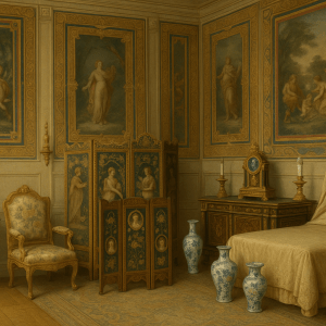 Four Gobelins(26) tapestries after Mignard’s(27) designs, trimmed with ornamental borders and leafy scrollwork, finished at the corners with spiral decorations, already clothed his bedchamber walls. A four-panel Savonnerie(28) screen, embellished with foxes, birds, cornucopias, fruit and blossoms, kept company with carved wooden furniture, gilt at the cross-braces, executed in the delicate needlework known as that of the Saint-Cyr ladies(29), displaying portrait roundels. There stood a pier table whose pedestal bore a female head, its green antique marble resting upon carved foliage; a Boulle(30) cabinet inlaid with brass and tortoiseshell; torch-holders with ovolo mouldings raised on acanthus-leaf supports; a timepiece wherein paired genii upheld the medallion of his beloved king; weighty candlesticks; vessels from Japan and China blooming with peonies and chrysanthemums, white, violet and blue, sprouting from chiselled bronze pedestals decorated with shells and coral sprays.